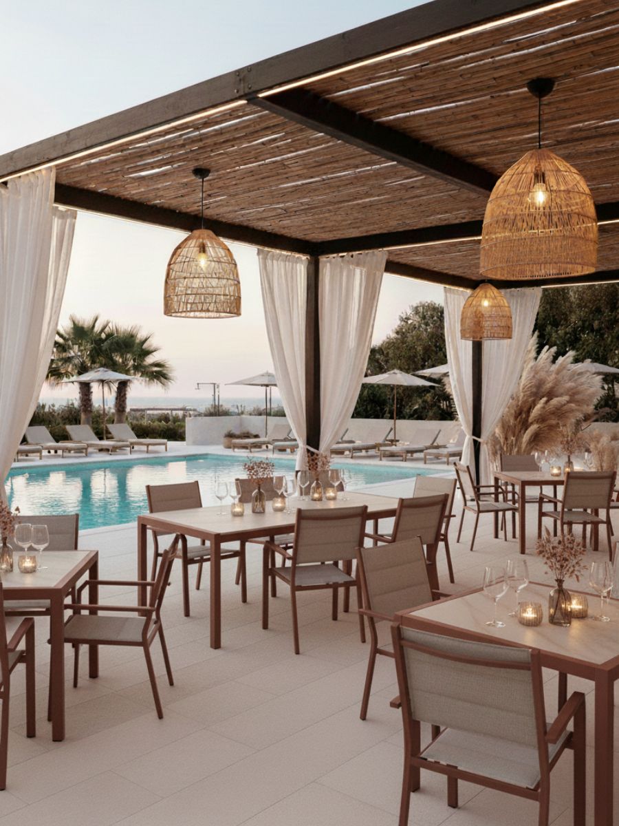 Para este proyecto, hemos suministrado y adaptado muebles de exterior e interior que unen estética, funcionalidad y resistencia, respondiendo a las exigencias de un hotel que busca ofrecer una experiencia única a sus huéspedes. Las piezas elegidas combinan calidad, diseño y durabilidad, resistiendo el uso intensivo y las condiciones climáticas propias del entorno mediterráneo.