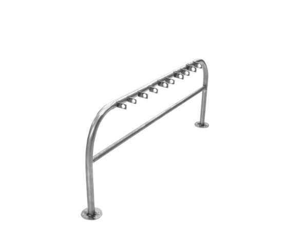 Aparcapatinetes de pletina de hierro galvanizado para 6 plazas. Robusto, duradero y perfecto para mantener los patinetes ordenados y seguros. Ideal para colegios, oficinas o comunidades.