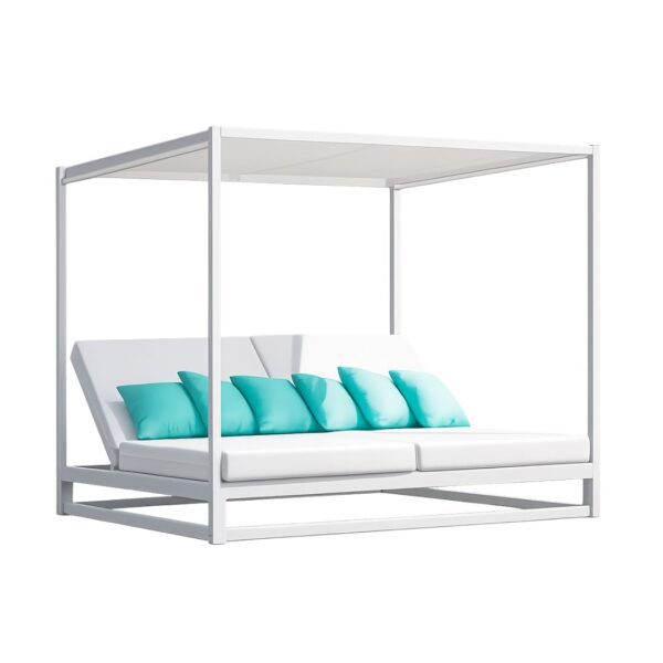 El dosel de la cama de exterior chill out TEXAS- 200 está meticulosamente diseñado y fabricado con tela especial que ofrece protección contra los dañinos rayos UV.nnnnEsta característica es fundamental para garantizar la seguridad y el bienestar de quienes disfrutan de la cama bajo el sol.