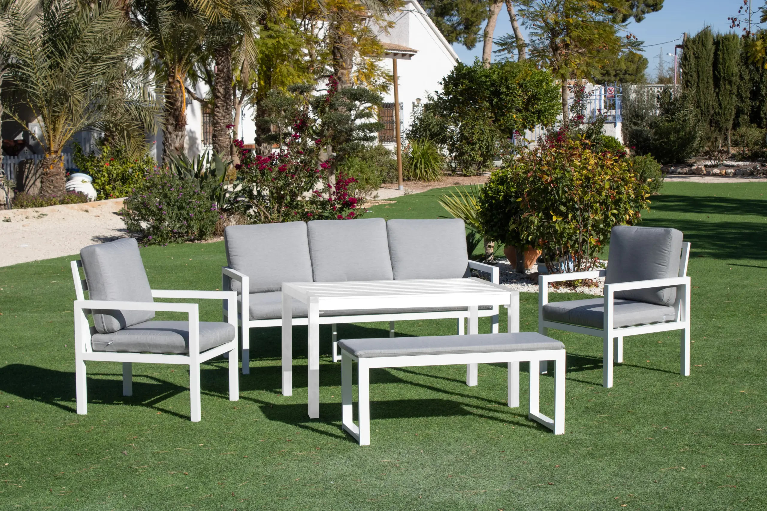 Conjunto de Exterior Mandalay-15 fabricado en España con sofá de 3 plazas, dos sillones, banco auxiliar y mesa de centro alta. Ideal para comidas informales.