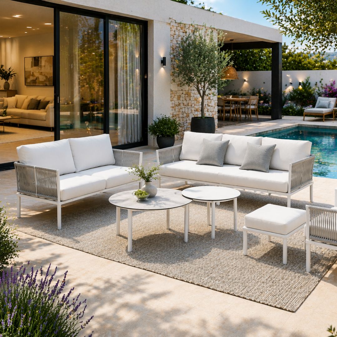 Conjunto de Jardín de Cuerda Cloe-14 compuesto por sofá de 2 plazas, sofá de 3 plazas, sillón individual, dos mesas redondas y reposapiés. Fabricado con cuerda de alta calidad y cojines de alta densidad para mayor confort y durabilidad.