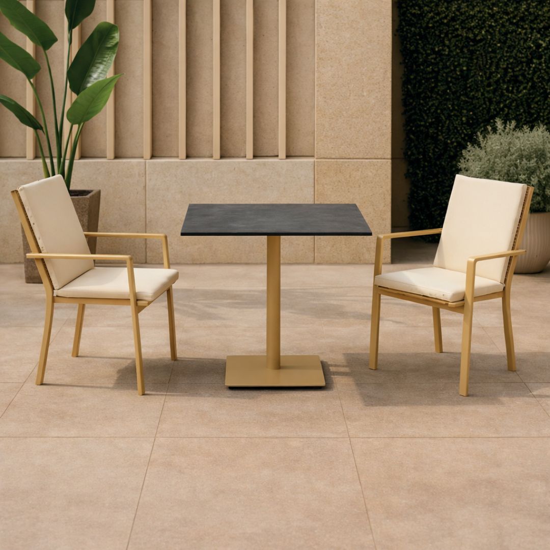 Conjunto de mesa cuadrada y dos sillas PAOLA/VASELIN 90 ideal para cafeterías y restaurantes que buscan mesas compactas y elegantes para dos personas. Su diseño funcional permite crear espacios de comedor cómodos manteniendo estabilidad, resistencia y durabilidad para uso intensivo en hostelería profesional.