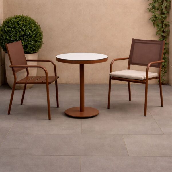 Conjunto de mesa redonda y sillas ADELID 90 /CELINA ideal para restaurantes y cafeterías que buscan mesas elegantes para varios comensales. Su formato redondo favorece la conversación y permite crear espacios de comedor cómodos y funcionales con resistencia y estabilidad para uso intensivo en hostelería.