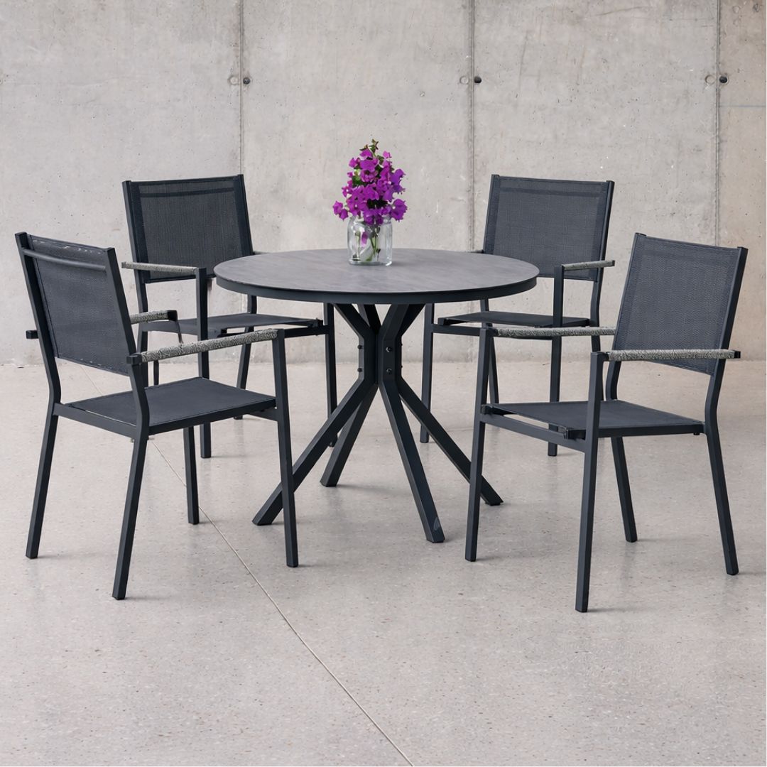 Conjunto de mesa y sillas exterior MOASIS/GIGLIO 100 ideal para restaurantes y terrazas que buscan mesas resistentes para varios comensales. Combina diseño moderno, estabilidad y durabilidad para hostelería.