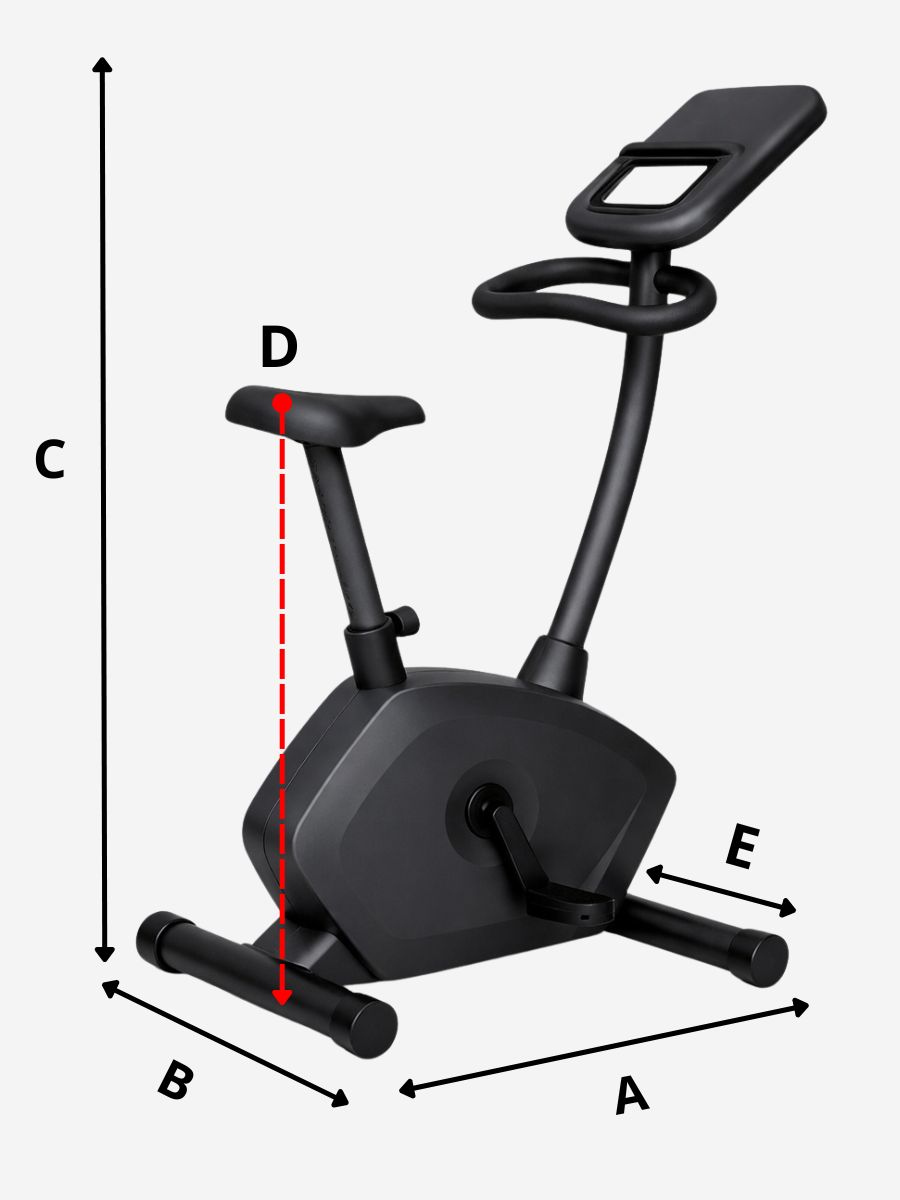 Para medir tu bicicleta estática, toma dimensiones clave: A (largo), de lado a lado incluyendo la base; B (ancho parte trasera) E (ancho parte delantera), desde la parte frontal hasta la trasera; y C (alto), desde el suelo hasta el punto más elevado. Con estas medidas, tu funda quedará perfectamente ajustada.