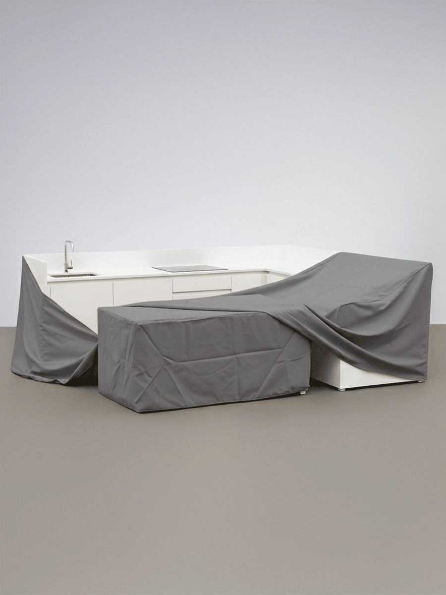 El tejido técnico de alta resistencia, con recubrimiento impermeable y tratamiento anti-UV, protege los materiales frente a la decoloración y la humedad, alargando la vida útil de tu cocina exterior. Además, incorporan sistemas de sujeción (cordones, cremalleras o velcros según necesidad) para garantizar estabilidad incluso en condiciones de viento.