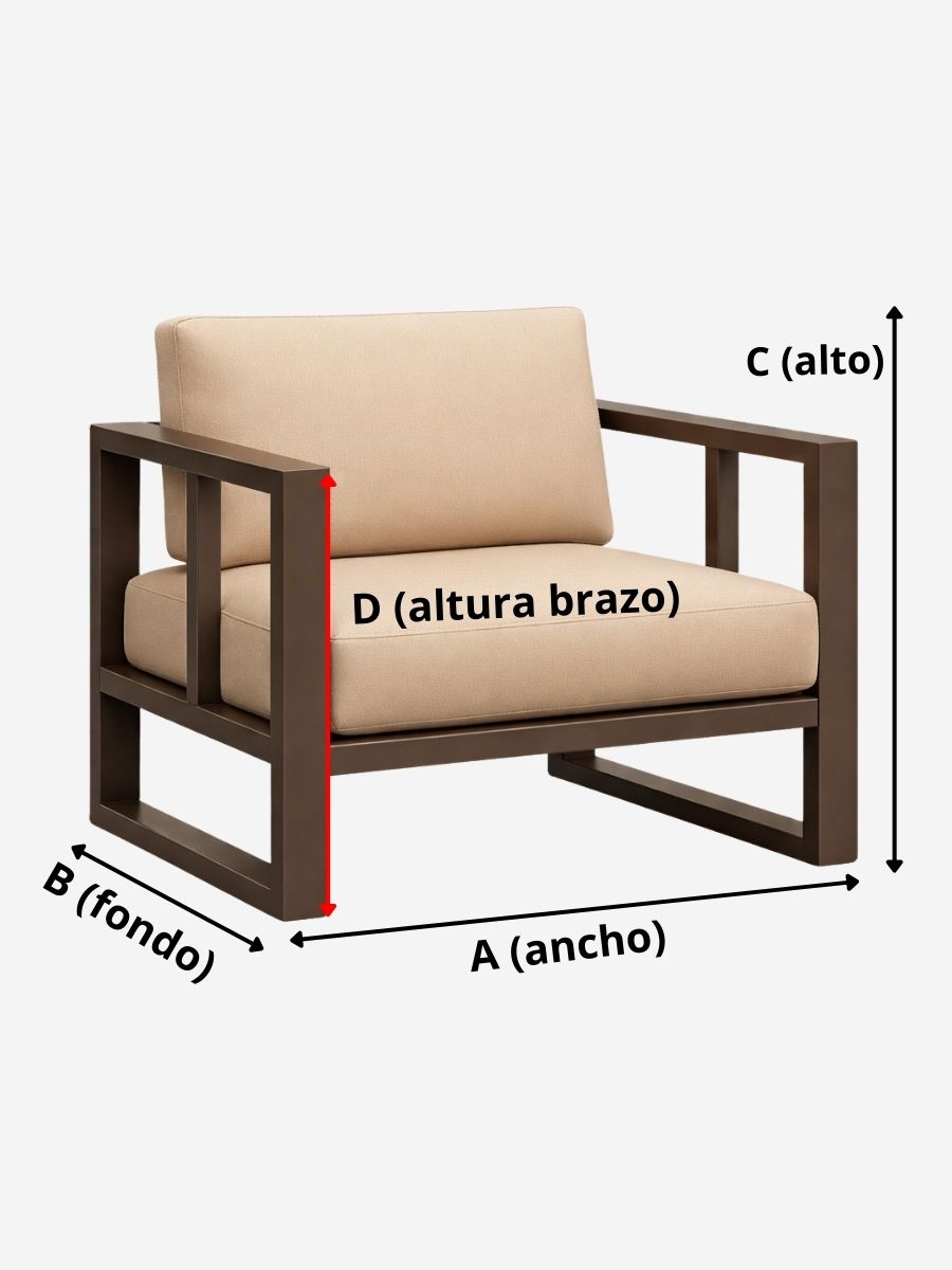 A (Ancho): Mide la longitud frontal total del sillón, de extremo a extremo de los brazos.