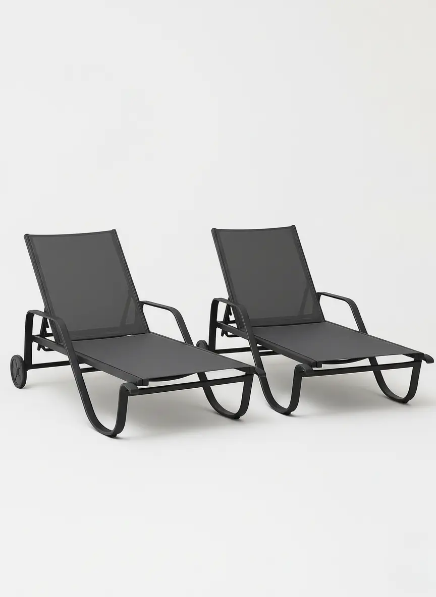 Lote de 2 tumbonas MARINA fabricadas en aluminio y textilene. Estas hamacas incluyen ruedas y un sistema reclinable de hasta 5 posiciones, ofreciendo comodidad y versatilidad para cualquier espacio exterior.