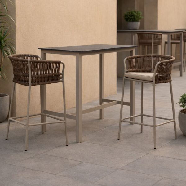 Mesa alta rectangular con taburetes de cuerda YUMEY 150/MIAMI ideal para bares y restaurantes que buscan mesas altas amplias y modernas. Su formato permite acomodar a varios clientes ofreciendo estabilidad, resistencia y diseño contemporáneo para uso intensivo.