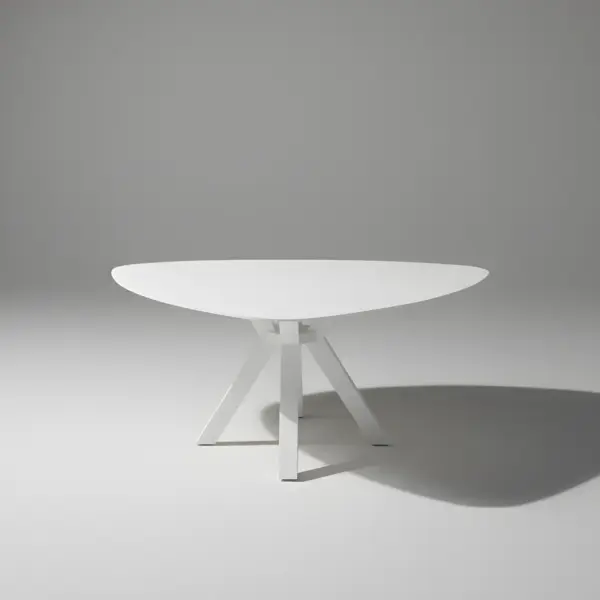 Mesa de comedor triangular de 150 cm con estructura de aluminio y amplia gama de tableros técnicos (HPL, Fenólico, Krion, Piedra). Diseño vanguardista para espacios únicos.