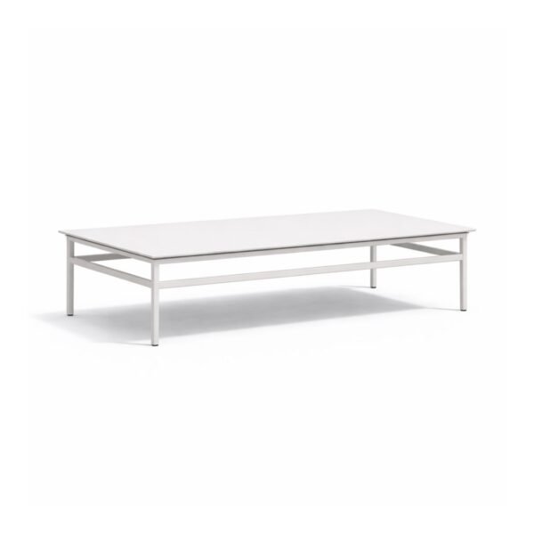 Mesa de centro rectangular VADARA de 120 cm, caracterizada por su estructura de aluminio reforzado con patas estilizadas. Fabricada en España, ofrece una superficie amplia y ligera, ideal para completar conjuntos de jardín con un toque moderno y resistencia total a la corrosión.