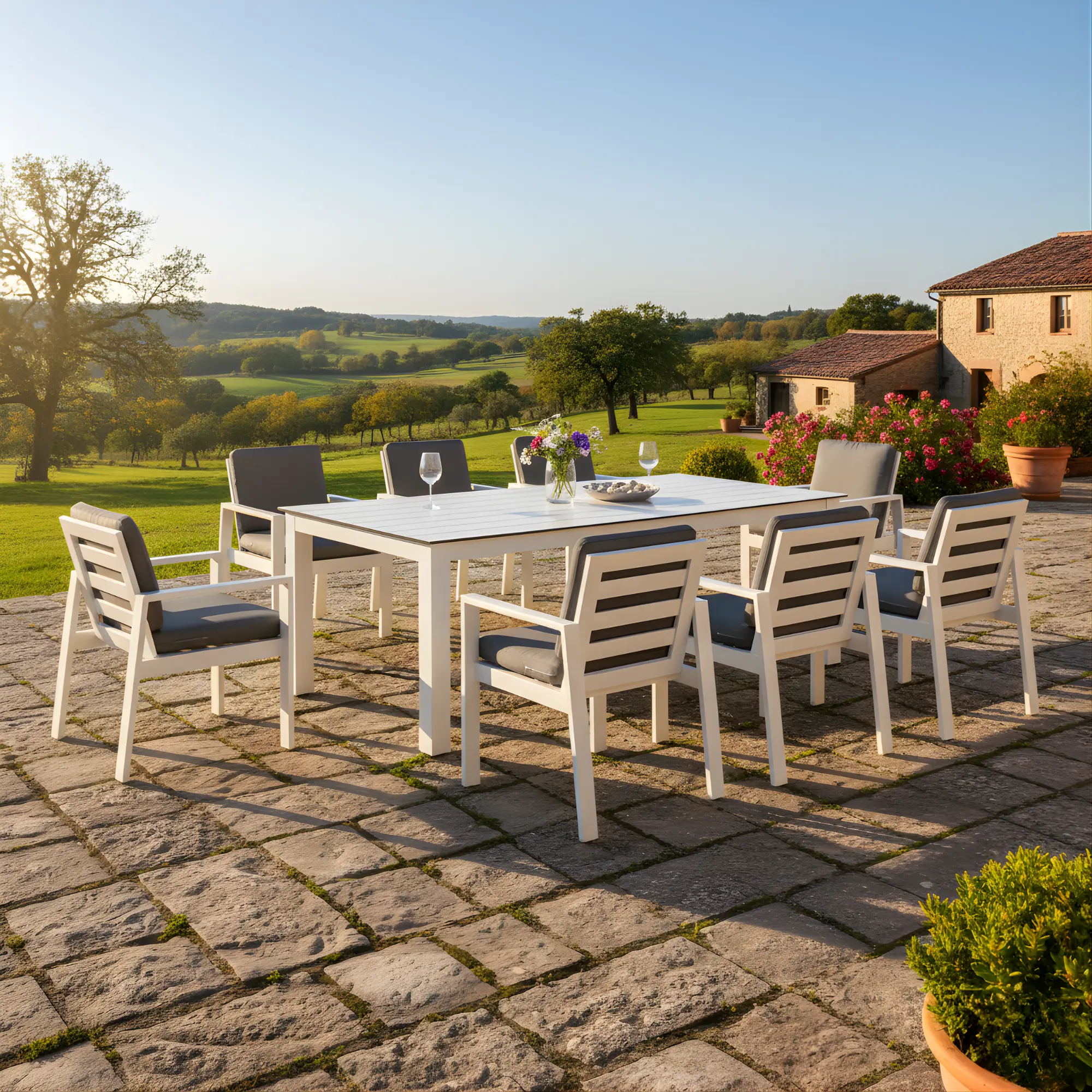 Con unas generosas dimensiones que favorecen la convivencia, la Camelia 220 es ideal para grandes reuniones al aire libre, comidas familiares o eventos con amigos. Su estructura de aluminio robusto no solo proporciona una excelente estabilidad, sino que además es ligera, inoxidable y totalmente personalizable, lo que permite adaptarla al estilo de cada espacio exterior.