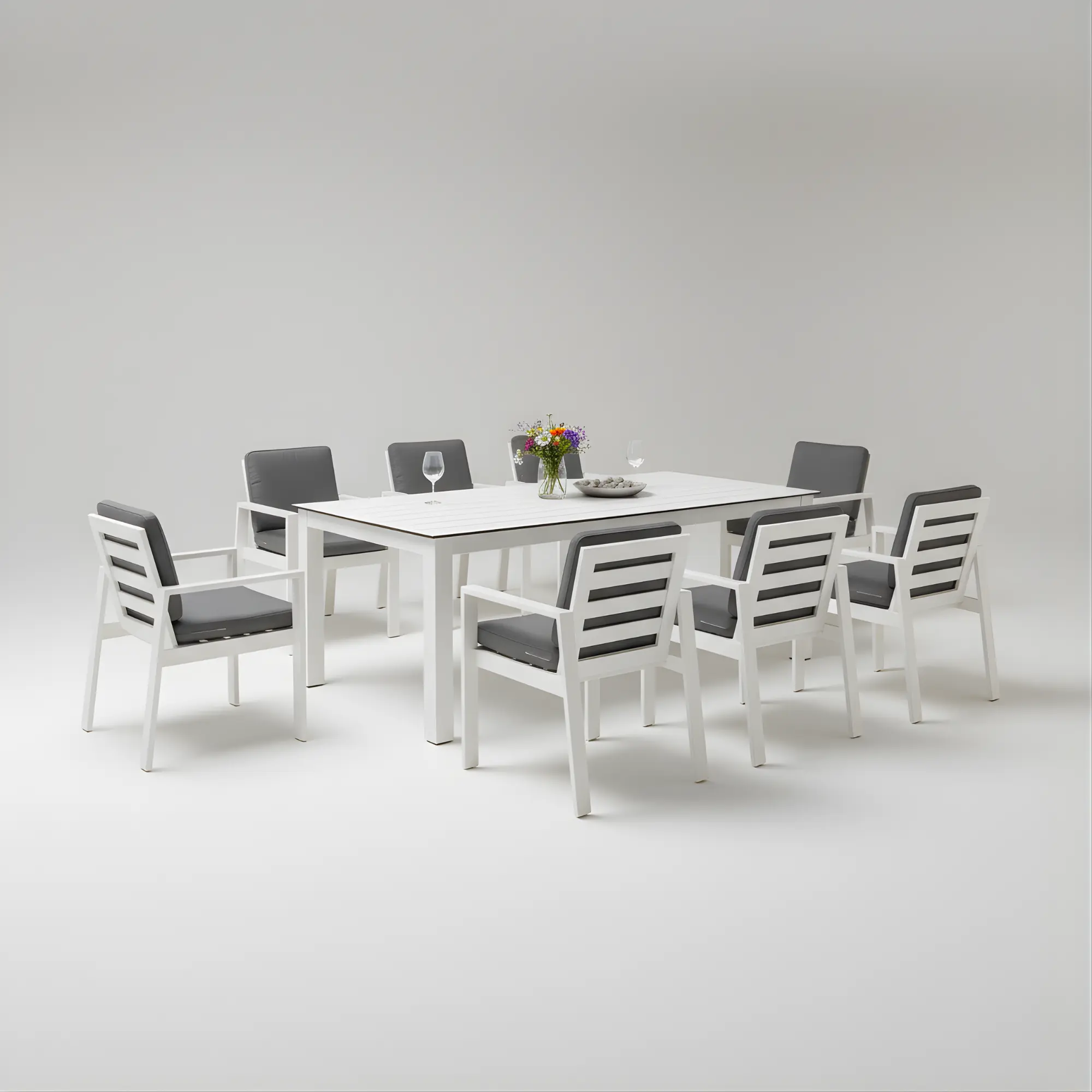 Disponible en una cuidada gama de acabados —blanco, pizarra, argenta y maderma—, esta mesa se adapta fácilmente tanto a entornos modernos como a ambientes más cálidos y naturales. Gracias a su diseño versátil y atemporal, la Camelia 220 HPL se convierte en una pieza clave para disfrutar del aire libre con estilo y confort.