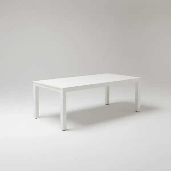 Mesa de comedor exterior de 220 cm con estructura de aluminio extrusado y tablero técnico personalizable. Diseño robusto y minimalista con capacidad para 8 personas.