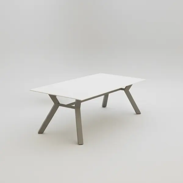 Mesa de comedor exterior Veneto (160 cm) de ingeniería premium y fabricación 100% nacional. Fusiona una robusta estructura de aluminio extrusado de alta pureza con una superficie personalizable de alto rendimiento (Fenólico, HPL, Krion® o Piedra Sinterizada), garantizando máxima resistencia a la intemperie y un diseño atemporal para espacios de tamaño medio.