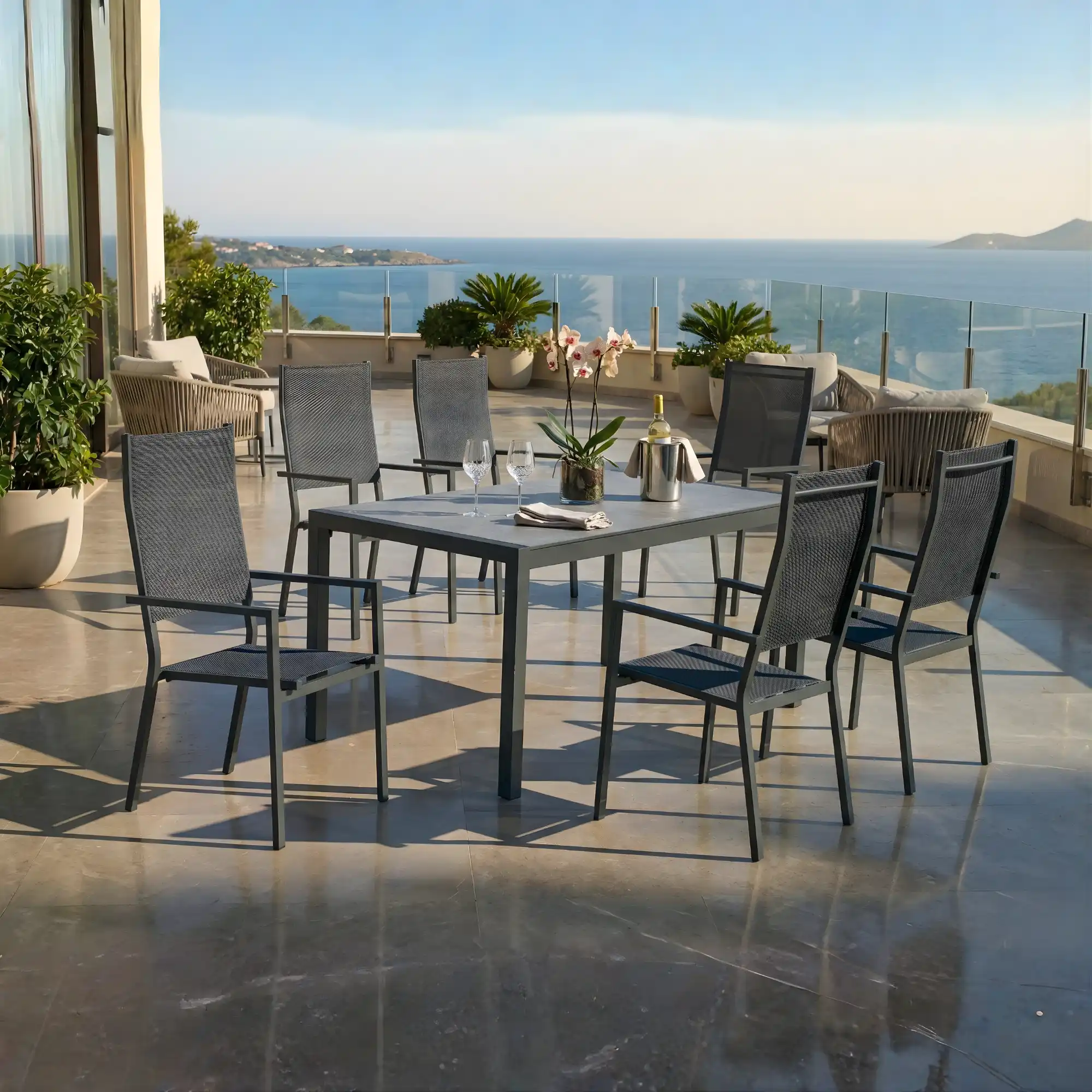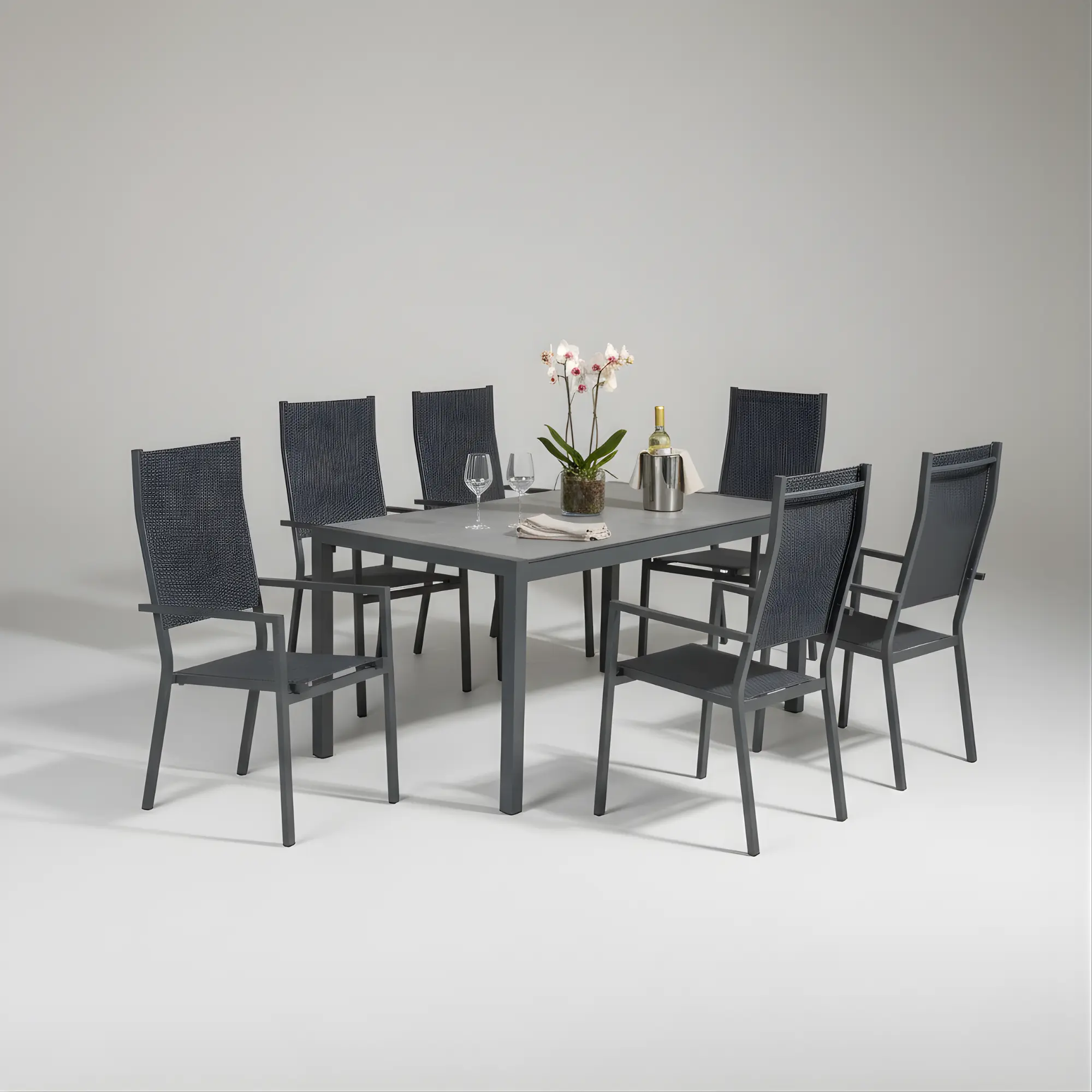 La mesa de jardín Palermo 160 ofrece un tablero cerámico resistente a la intemperie y arañazos, combinado con una estructura de aluminio ligera y estable. Su diseño sofisticado y atemporal la hace ideal para cualquier terraza o jardín.