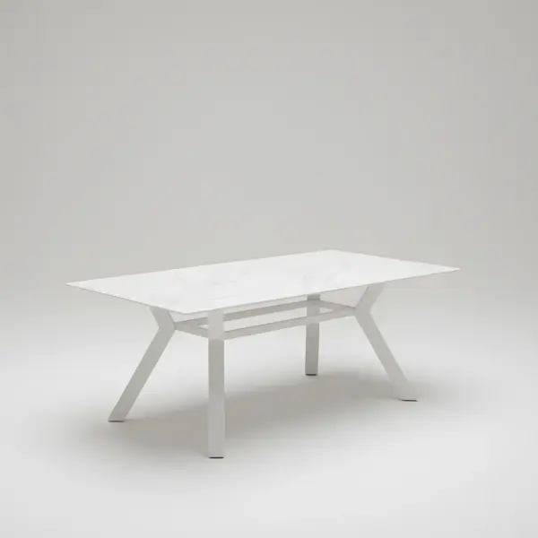 Mesa de comedor exterior Veneto (240 cm) de ingeniería premium y fabricación 100% nacional. Fusiona una robusta estructura de aluminio extrusado de alta pureza con una superficie personalizable de alto rendimiento (Fenólico, HPL, Krion® o Piedra Sinterizada), garantizando máxima resistencia a la intemperie y un diseño atemporal para proyectos exclusivos.