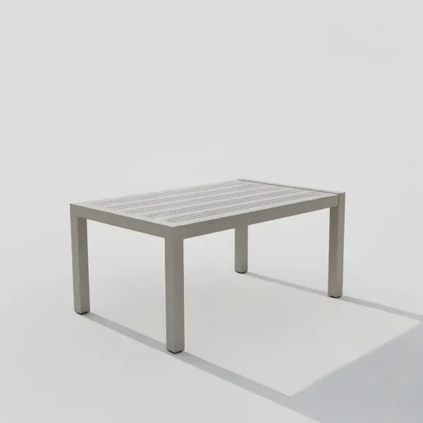 Mesa de comedor exterior de 180 cm fabricada íntegramente en aluminio con sobre de lamas. Diseño robusto y atemporal personalizable en color.