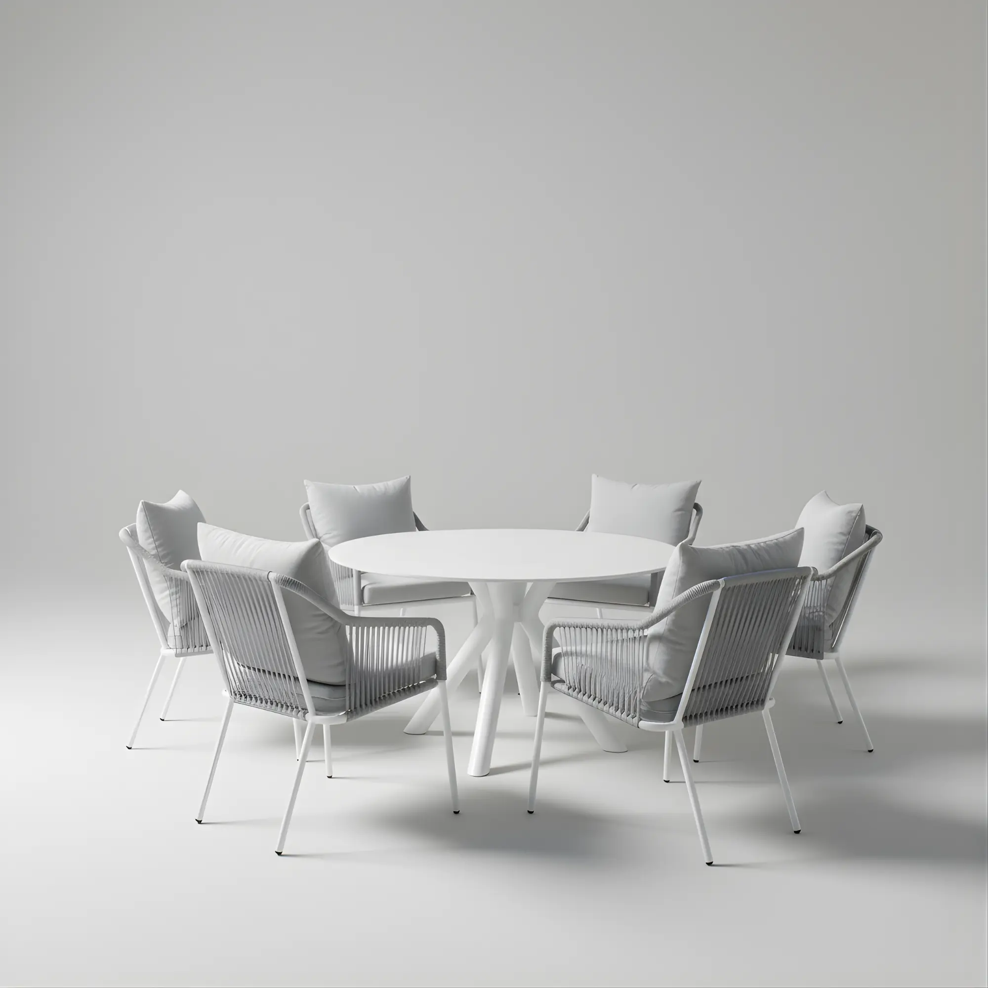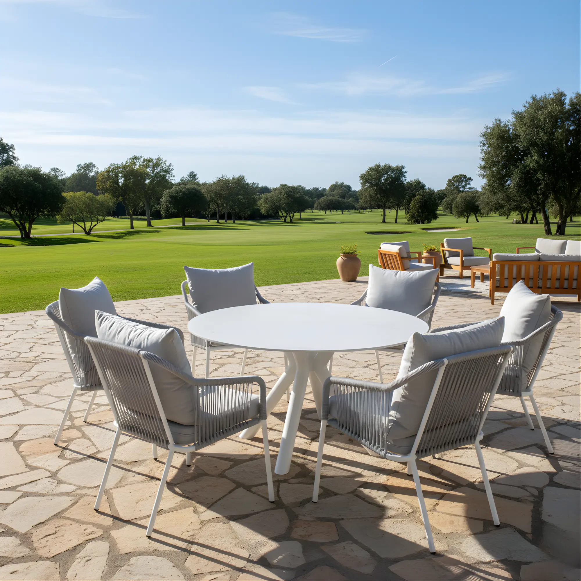 La mesa Palawan Olimpo Ø150 destaca por su diseño redondo exclusivo y su tablero de piedra natural, que garantiza resistencia y durabilidad frente al clima. Con estructura protegida con pintura Qualicoat, es ideal para terrazas, jardines y espacios de hostelería, aportando sofisticación y funcionalidad al aire libre.
