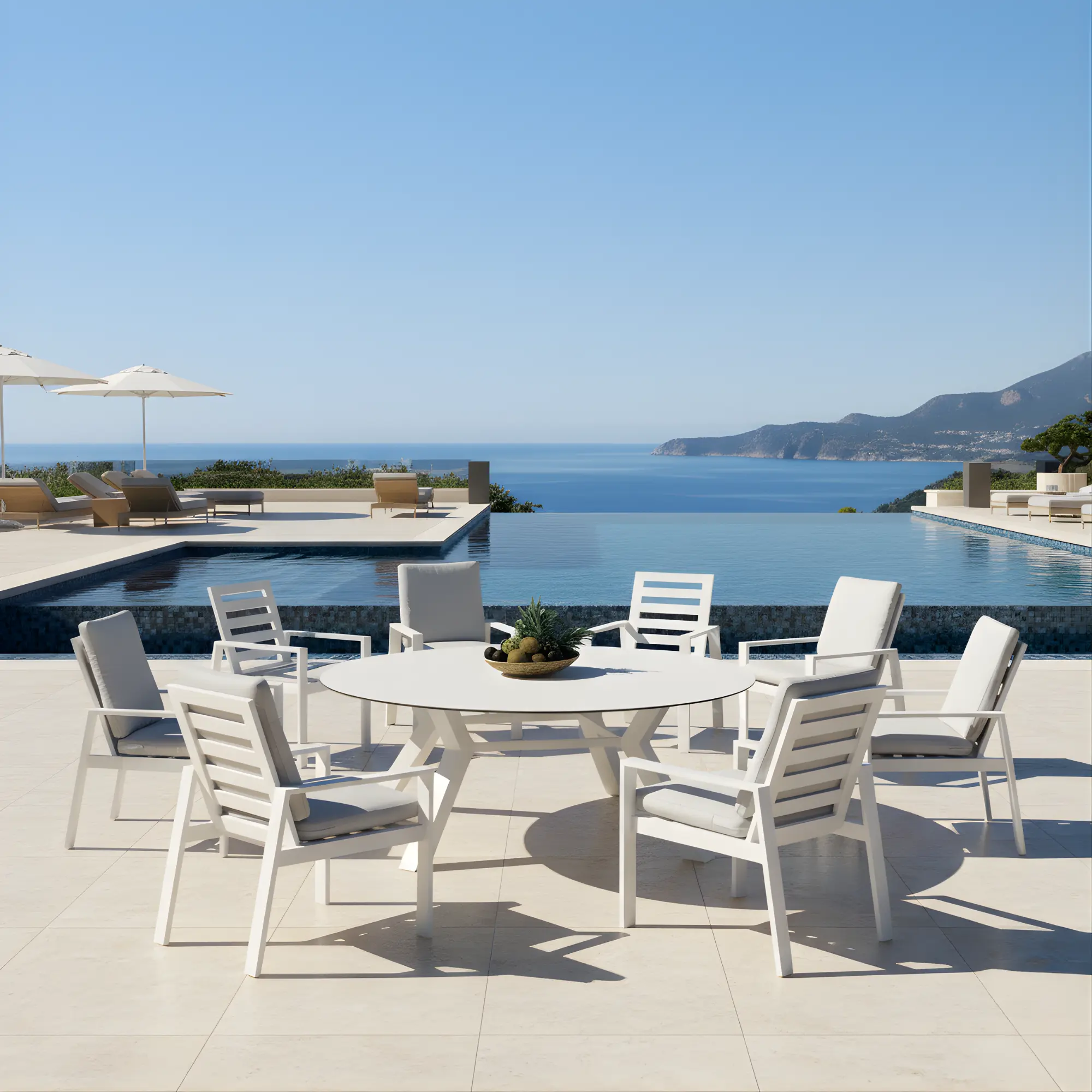 La mesa Sumatra Ø180 combina resistencia, estilo y funcionalidad para espacios al aire libre. Su estructura de aluminio y su tablero de HPL aseguran una alta durabilidad frente a rayones, humedad y calor. Disponible en acabados blanco, pizarra, argenta y maderma, es perfecta para reuniones cómodas y elegantes al aire libre.