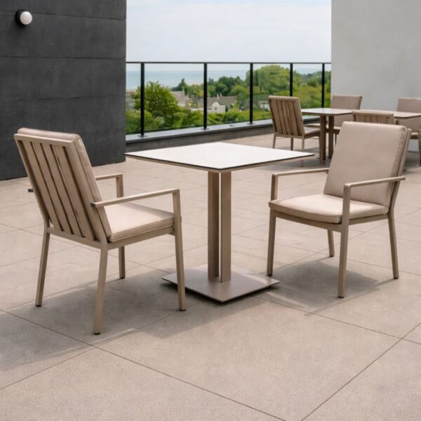 Mesa y sillas para restaurante PAOLA/CANVAS 90 perfecta para restaurantes y cafeterías que buscan mesas compactas y resistentes. Permite crear espacios de comedor cómodos para clientes manteniendo estabilidad y durabilidad para uso intensivo en hostelería.