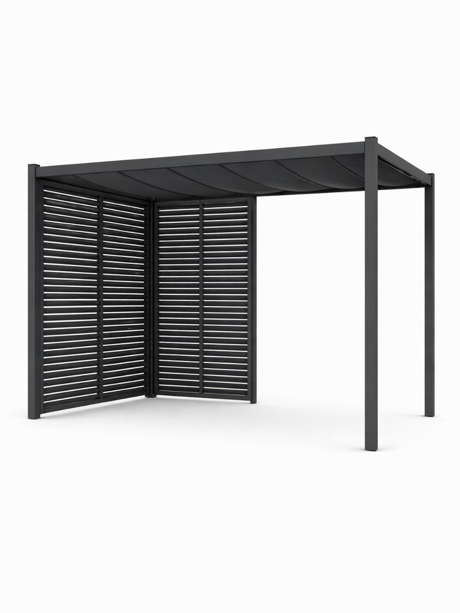Pérgola de aluminio antracita con cerramientos de lamas en esquina y frente abierto. Equilibrio perfecto entre protección, ventilación y apertura del espacio.