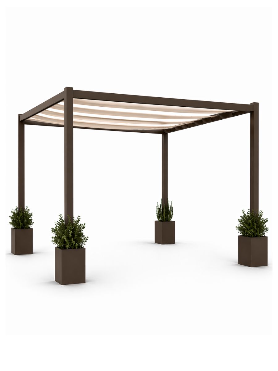 Pérgola de exterior con 4 jardineras de aluminio rellenables y toldo fijo de textilene, ideal para jardines.