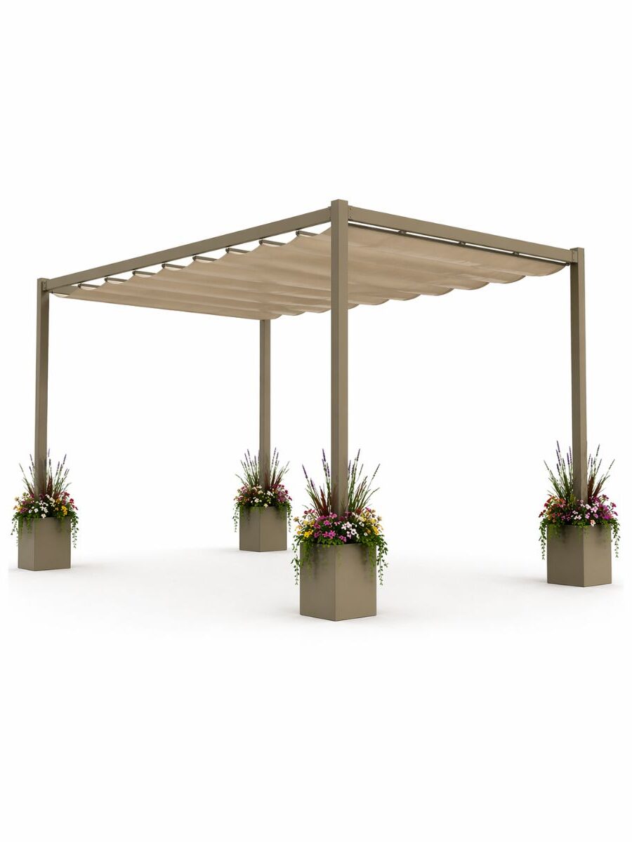 Pérgola de exterior con 4 jardineras de aluminio rellenables con toldo retráctil, perfecta para jardines grandes.