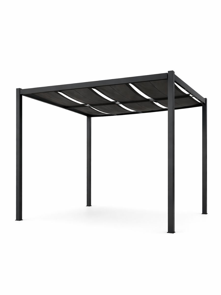 Pérgola de aluminio con toldo fijo para jardín, anclada al suelo. Dimensiones: 300x300x250 cm.