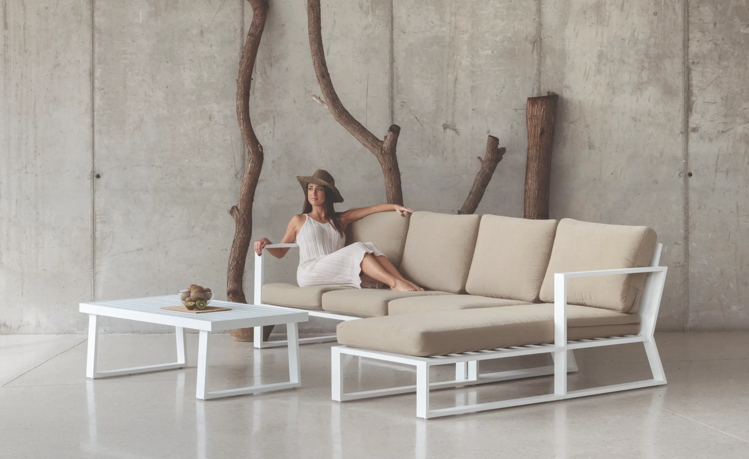 Material: Aluminio. Cojines: Alta densidad, resistentes a los rayos UV. Colores: Personalizables. Reposapiés no incluidos en el precio. Sofá 3 plazas: 204x70x100 cm Sillón individual: 77x70x100 cm Mesa: 135x60x40 cm