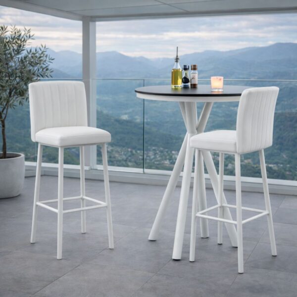 Set de mesa y dos taburetes altos CANVAS/NEMUS ideal para bares, cafeterías y terrazas modernas que buscan mesas altas compactas y funcionales. Su diseño contemporáneo permite crear espacios dinámicos para consumiciones rápidas, ofreciendo estabilidad, resistencia y durabilidad para uso intensivo en hostelería profesional.