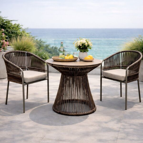 Set de mesa y sillas restaurante MIAMI/RODHOS 90 perfecto para restaurantes y terrazas que buscan mesas funcionales y resistentes. Su diseño moderno permite crear espacios de comedor cómodos para clientes manteniendo estabilidad y durabilidad para uso intensivo en hostelería.