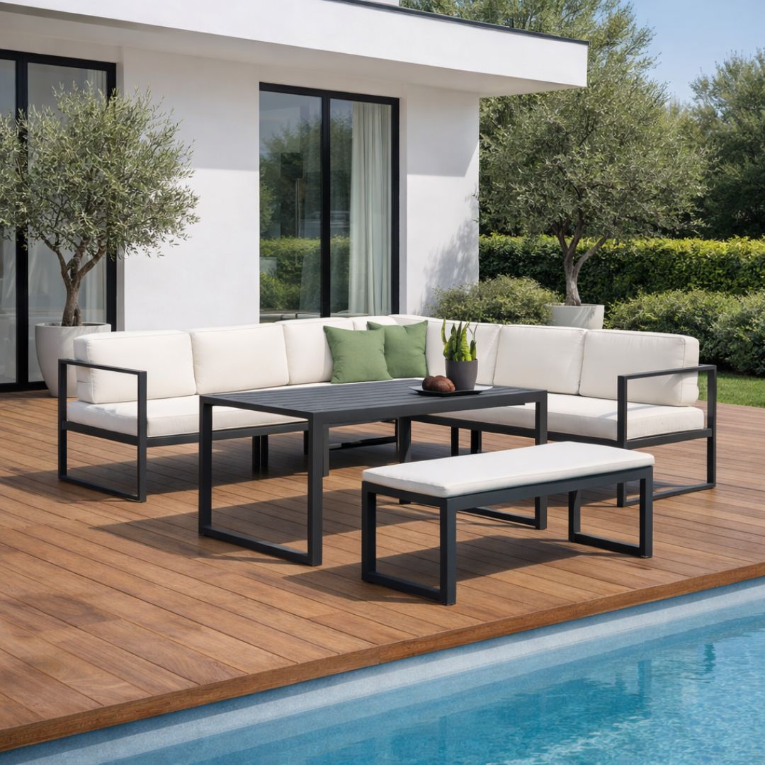 Set rinconera modular fabricado en aluminio, compuesto por sofás, banco auxiliar y mesa alta. Pensado para exteriores amplios, permite un uso combinado como zona de relax y comedor, destacando por su resistencia y diseño actual.
