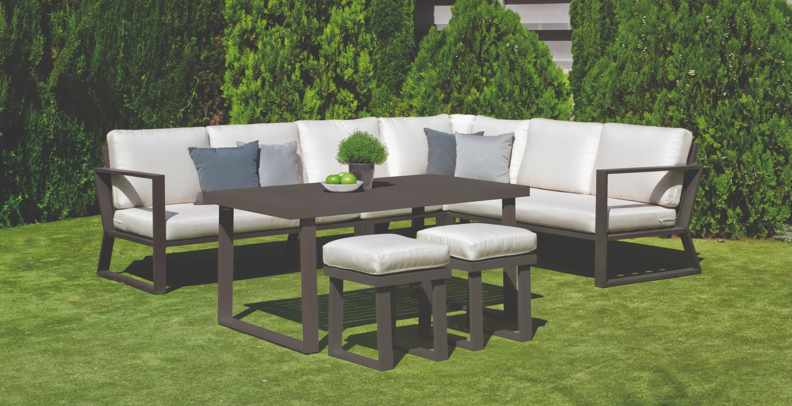 Material: Aluminio. Cojines: Alta densidad, resistentes a los rayos UV. Colores: Personalizables. Reposapiés no incluidos en el precio. Sofá 3 plazas: 204x70x100 cm Sillón individual: 77x70x100 cm Mesa: 135x60x40 cm
