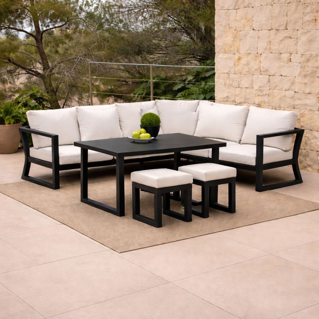 Set Rinconera de Jardín Bolonia-30 con módulos independientes para configurar tu espacio exterior con total libertad. Estructura de aluminio y estética contemporánea.