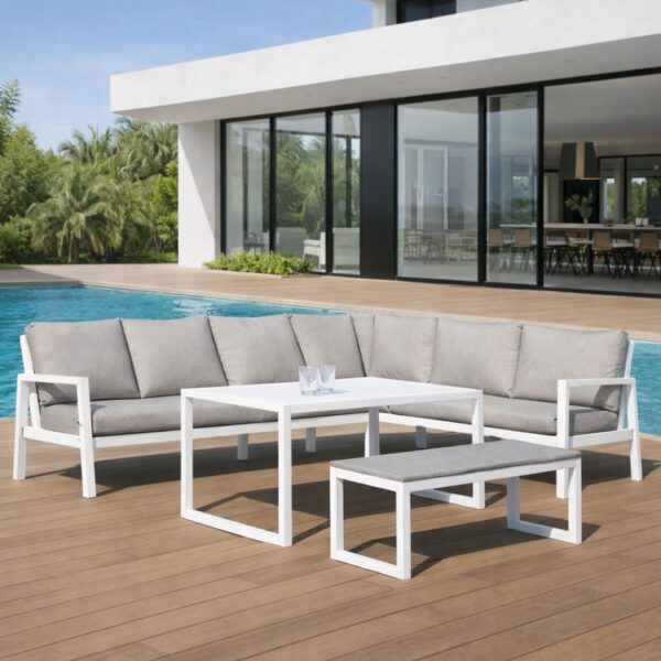 Set rinconera fabricado en aluminio con mesa alta y banco auxiliar, diseñado para crear un comedor exterior funcional. Incluye sofás y módulos complementarios, ofreciendo resistencia, versatilidad y una estética moderna adaptada a exteriores.