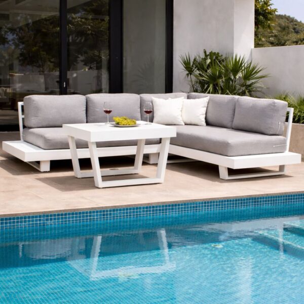 Rinconera modular de aluminio con mesa alta integrada, diseñada para combinar zona de relax y comedor exterior. Incluye varios módulos de sofá y mesa, ofreciendo versatilidad, resistencia estructural y una estética actual para uso prolongado.