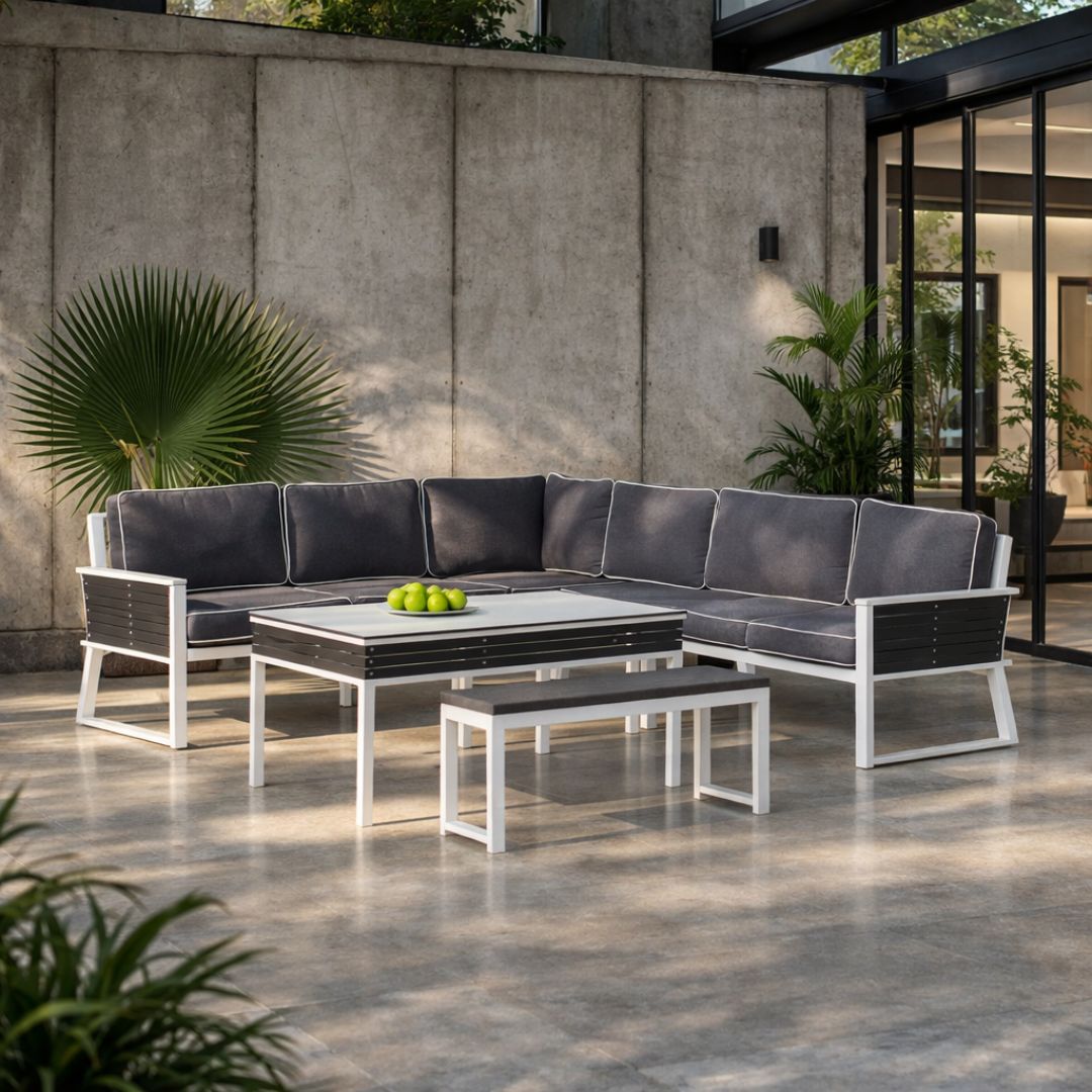 Rinconera modular de aluminio con diseño contemporáneo, compuesta por sofás, banco auxiliar y mesa. Su estructura robusta y sus acabados la convierten en una opción funcional para exteriores amplios. Diseñada para uso continuado, ofrece versatilidad, resistencia y un estilo actual.