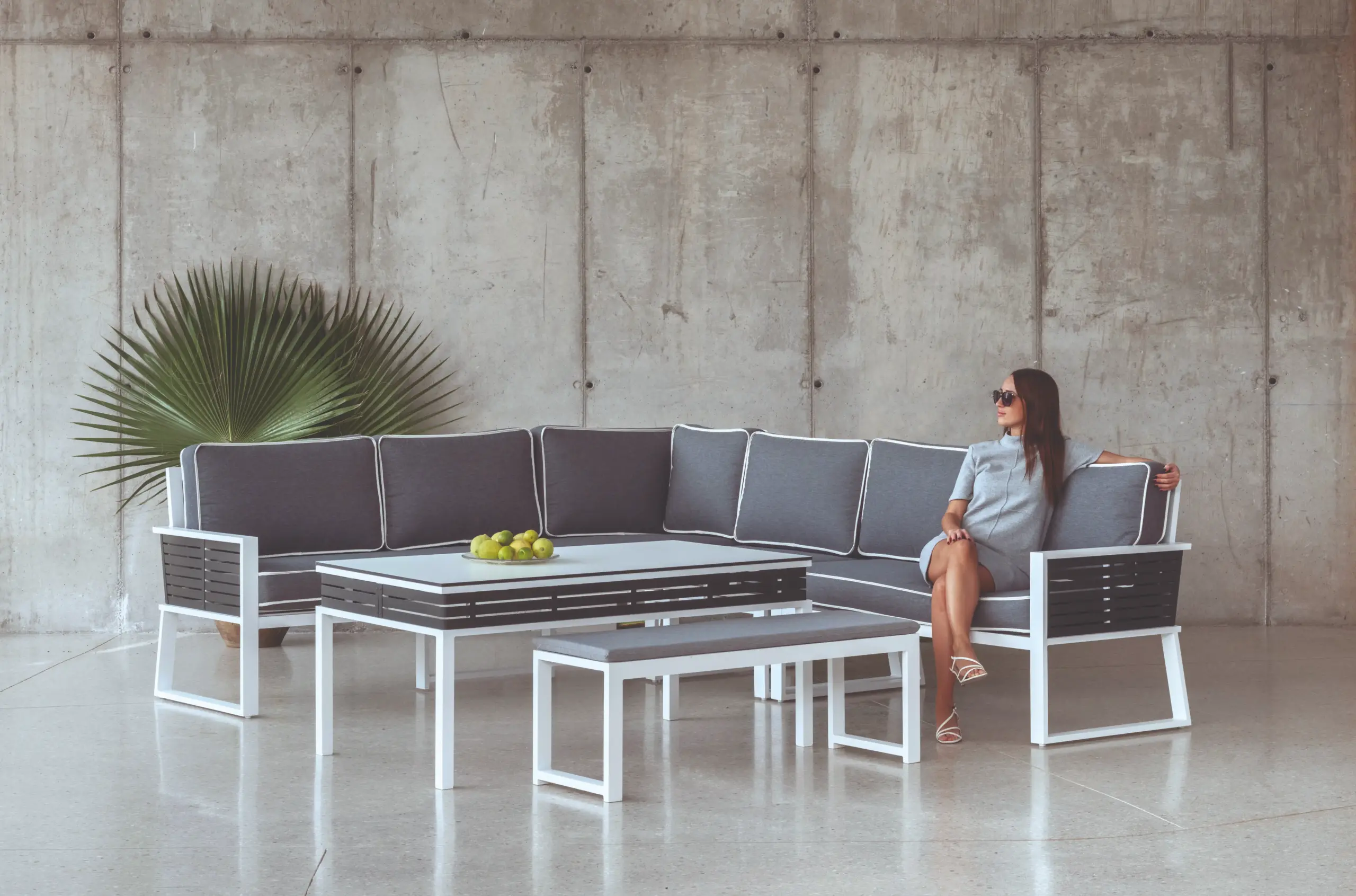 Material: Aluminio. Cojines: Alta densidad, resistentes a los rayos UV. Colores: Personalizables. Reposapiés no incluidos en el precio. Sofá 3 plazas: 204x70x100 cm Sillón individual: 77x70x100 cm Mesa: 135x60x40 cm