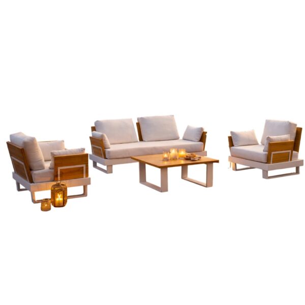 Conjunto de exterior DEDALO 7 que incluye un sofá de dos plazas, dos sillones y una mesa de centro. Su estructura de aluminio reforzado de fabricación nacional ofrece un diseño de líneas arquitectónicas y gran presencia, garantizando una resistencia total a la corrosión.