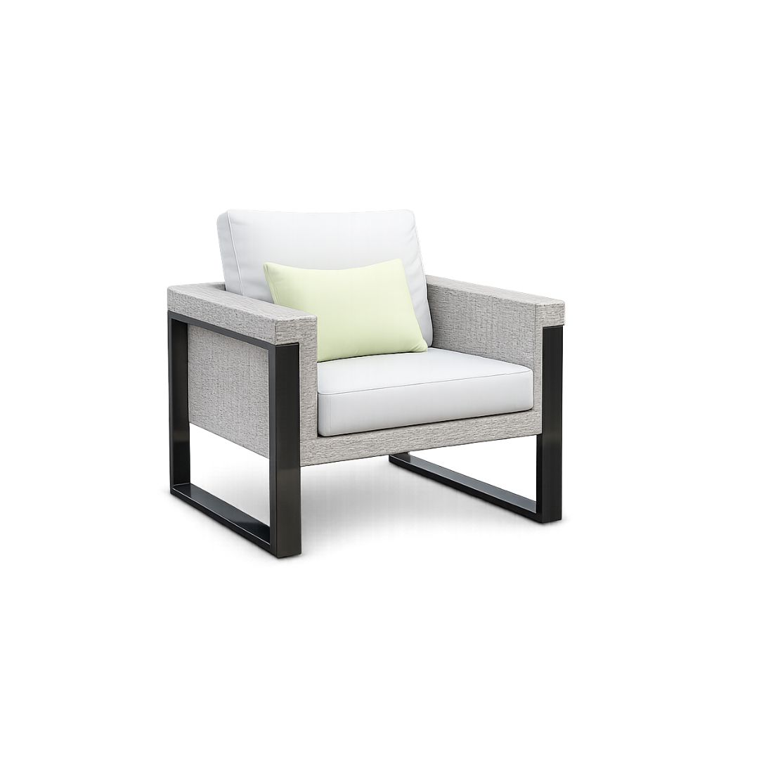 Sillón de exterior de cuerda de una plaza con estructura de aluminio reforzado y trenzado artesanal en cuerda náutica. Diseño contemporáneo de fabricación nacional con resistencia total a la intemperie.