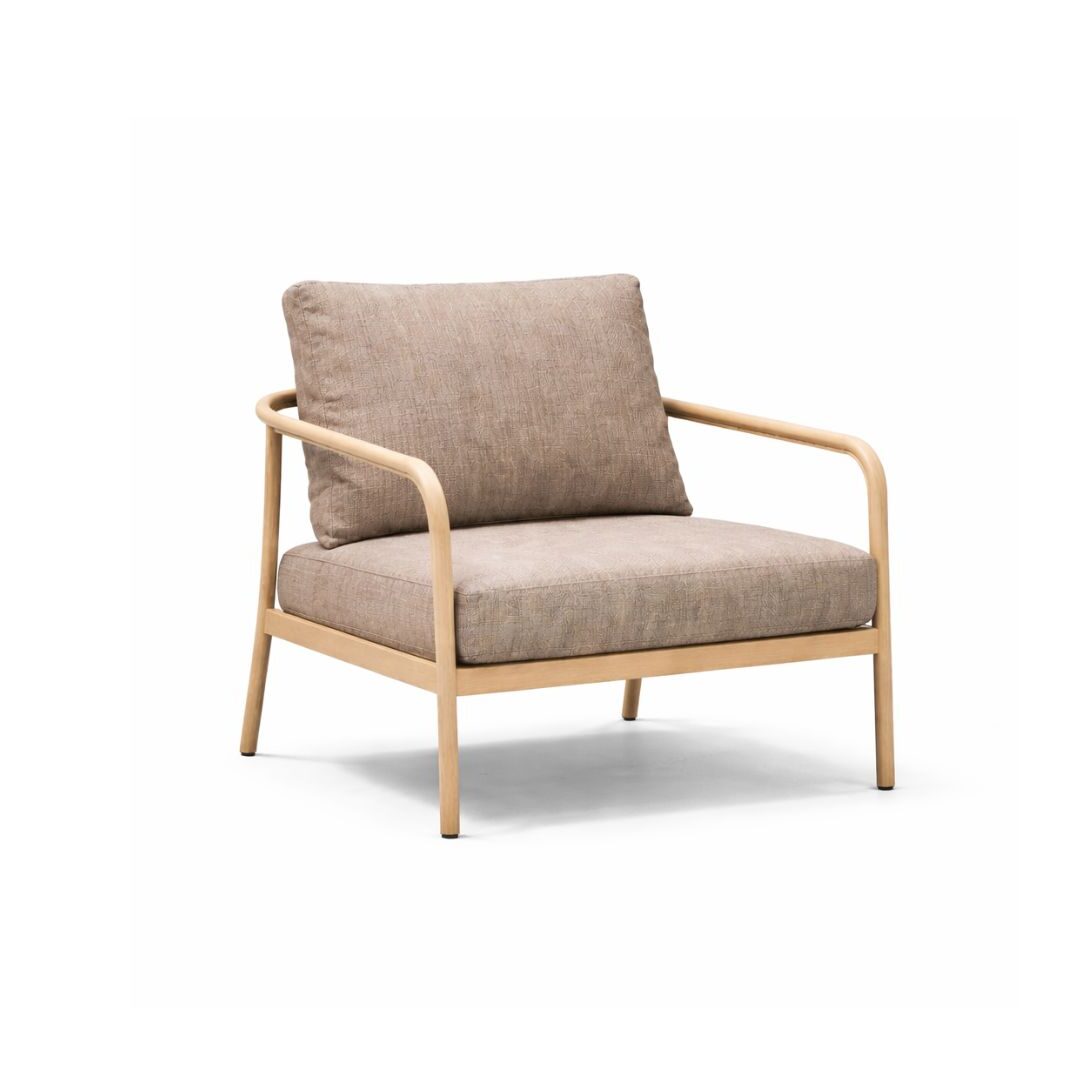 Sillón de exterior CORINTO de una plaza con estructura de aluminio reforzado y acabado lacado suave. Su diseño de líneas curvas y modernas ofrece un confort excepcional, garantizando una resistencia total a la corrosión y una estética ligera para rincones de relax.