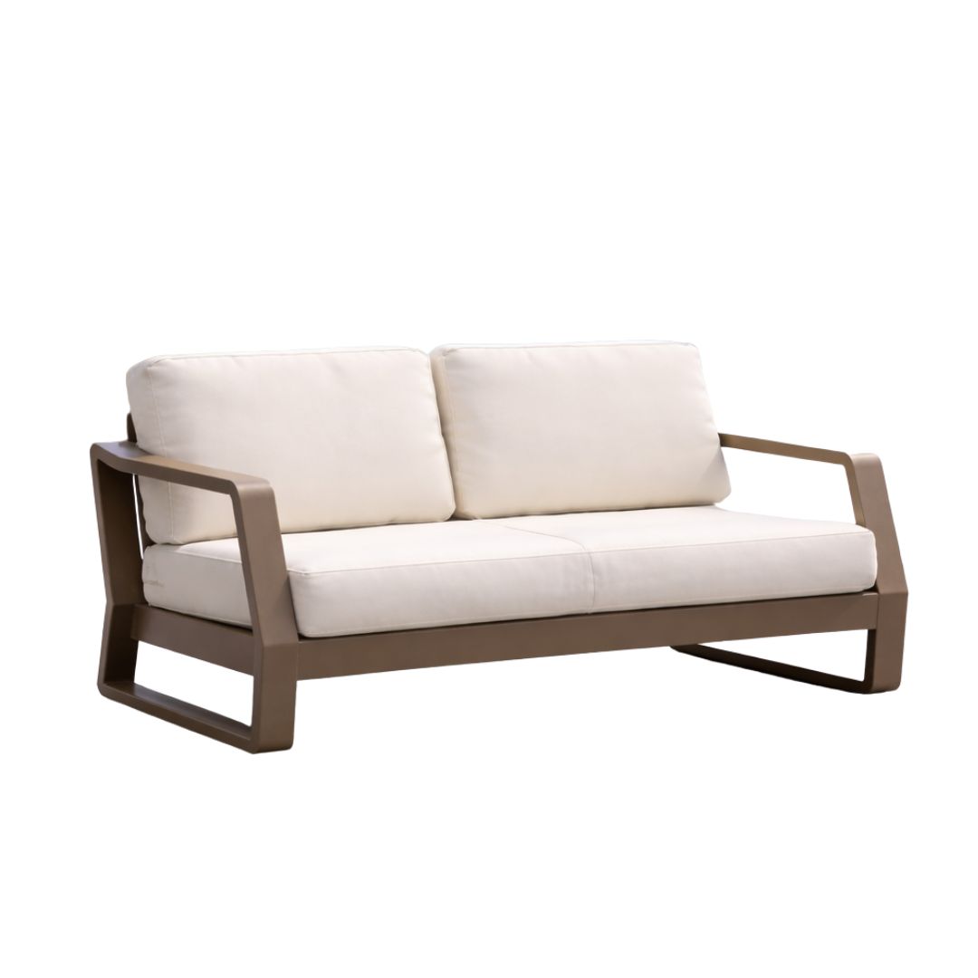 Sofá de exterior ARMANIA de dos plazas con estructura de aluminio reforzado y fabricación nacional. Diseño minimalista de líneas estilizadas que ofrece un confort excepcional y resistencia total a la corrosión.