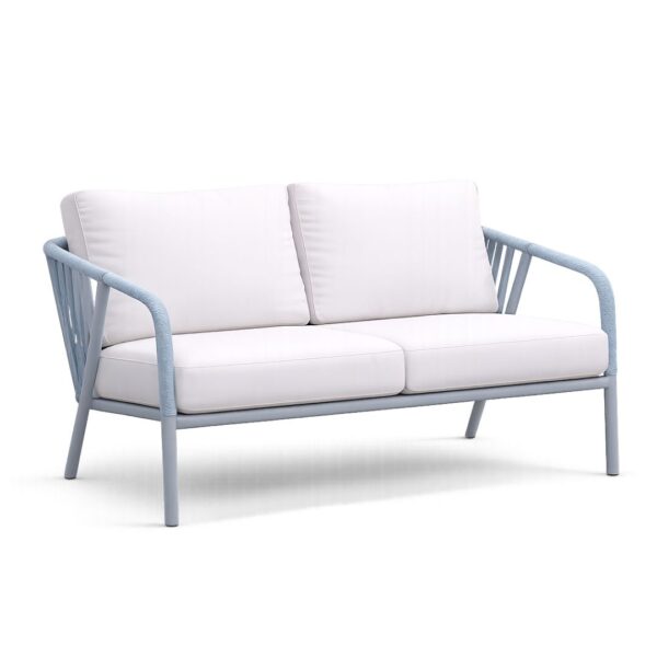Sofá de exterior MELBOURNE de dos plazas con estructura de aluminio reforzado y fabricación nacional. Su diseño moderno de líneas rectas ofrece un confort excepcional, garantizando una resistencia total a la corrosión para terrazas y balcones contemporáneos.