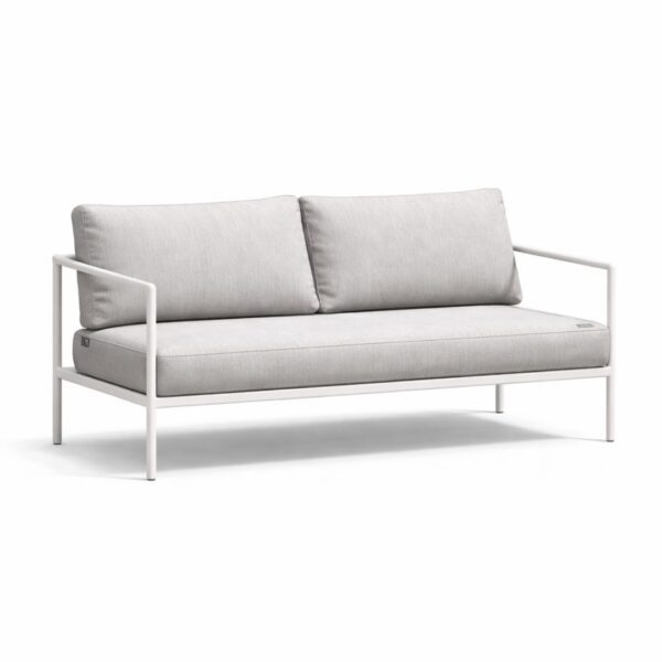 Sofá de exterior VADARA de dos plazas con estructura de aluminio reforzado y fabricación nacional. Presenta un diseño minimalista de patas elevadas que aporta ligereza visual, garantizando una resistencia total a la corrosión y un confort excepcional para terrazas modernas.